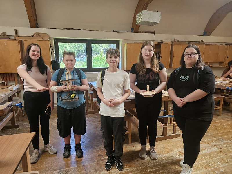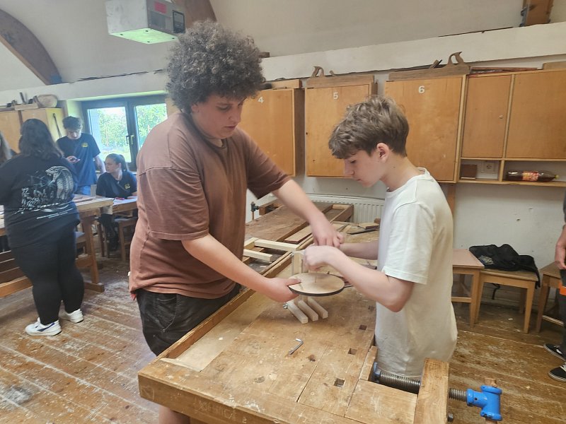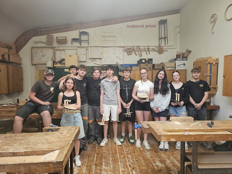 Žáci 8.A si v dopoledních hodinách osvojili základní techniky práce se dřevem pod vedením učitelů odborného výcviku a jejich studentů. Během workshopu si osmáci vyrobili stojánek, podívali se do odborných učeben a seznámili se s možným uplatněním na trhu práce v rámci oborů, které nabízí střední škola v Bystřici pod Hostýnem.