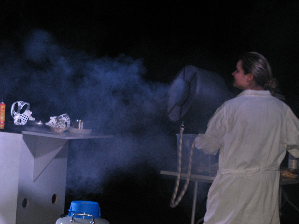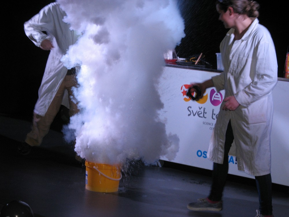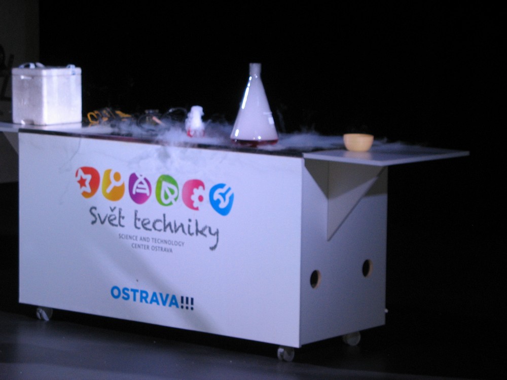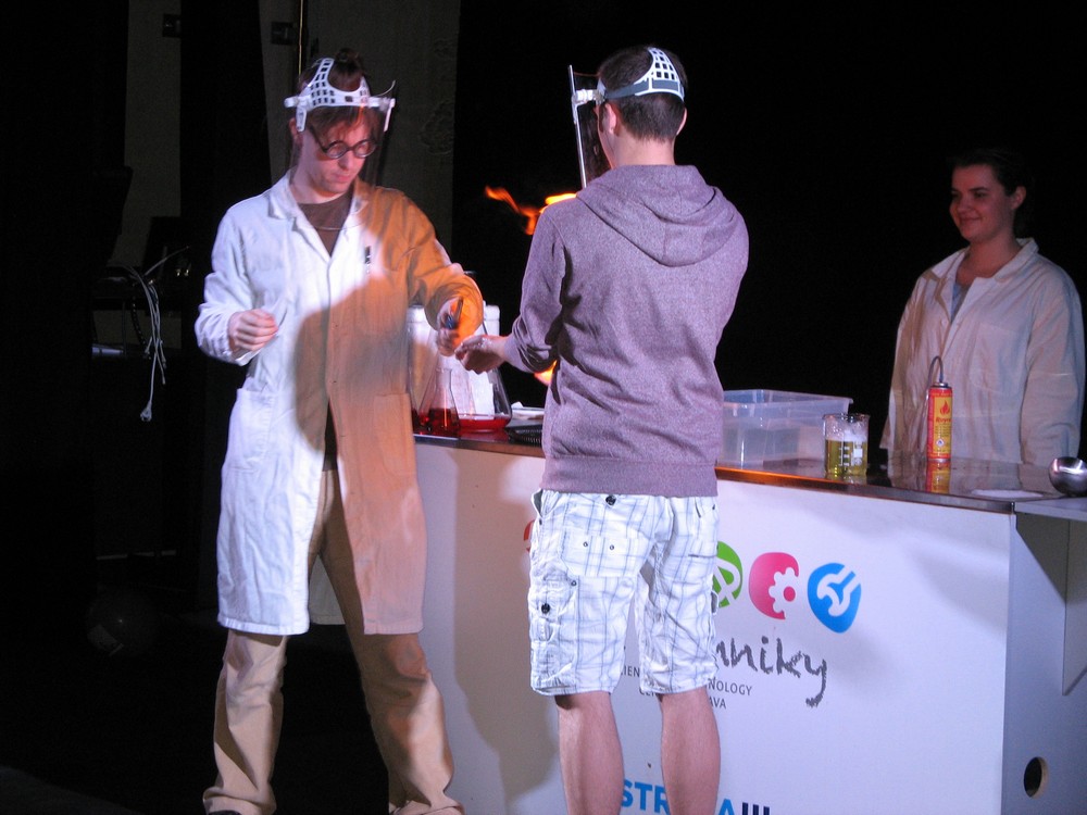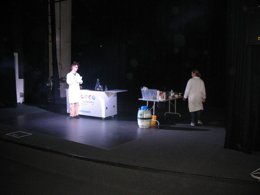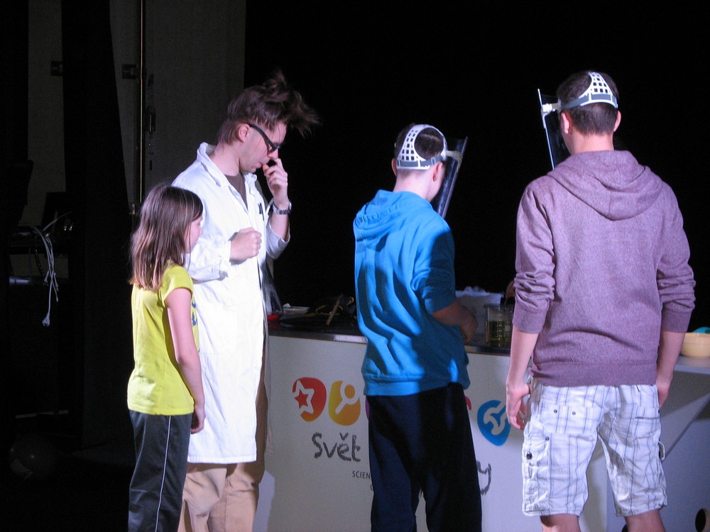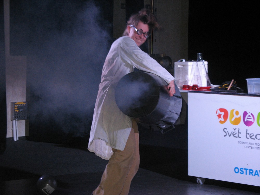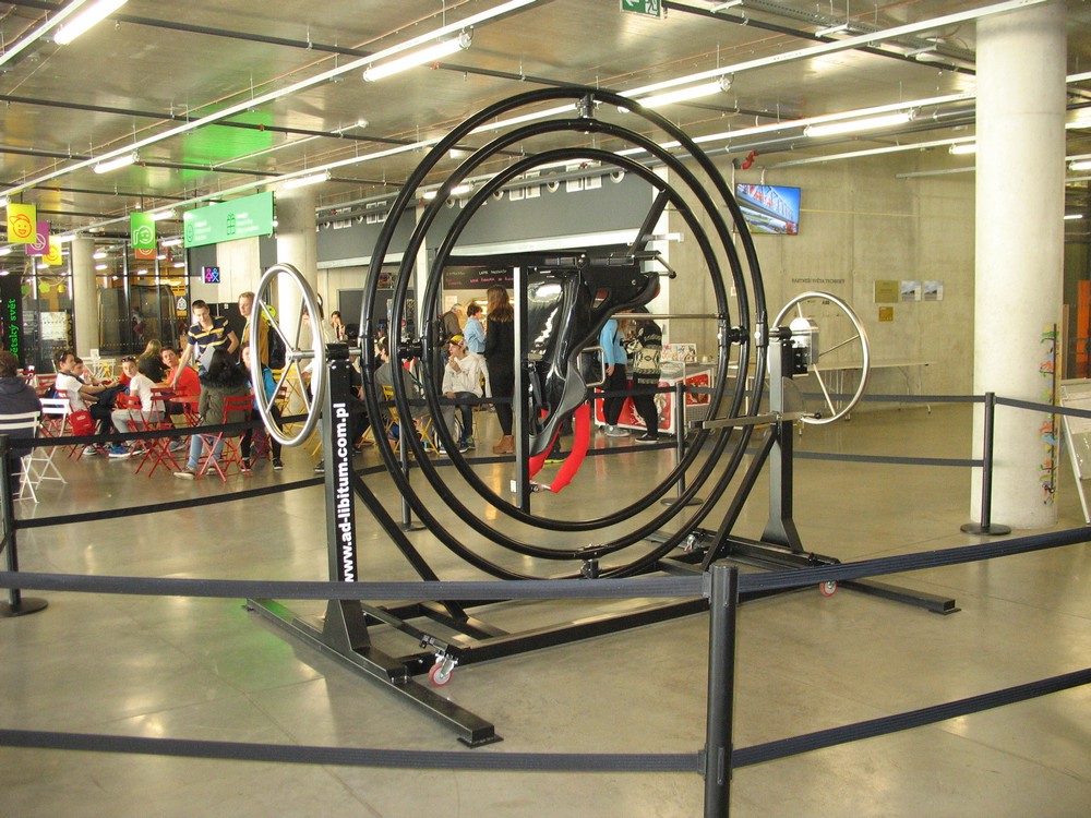 Na závěr si někteří z nás užili plno legrace – jednak v „Divadle vědy“ s povedenou dvojicí chemiků, jednak při „veletočích“, kdy odvážlivci zažili trošku výcviku kosmonautů a procházeli na „trenažéru“ opravdu těžkou zkouškou – snést rychlý otáčivý pohyb kolem všech tří os, navíc ještě nepravidelný.