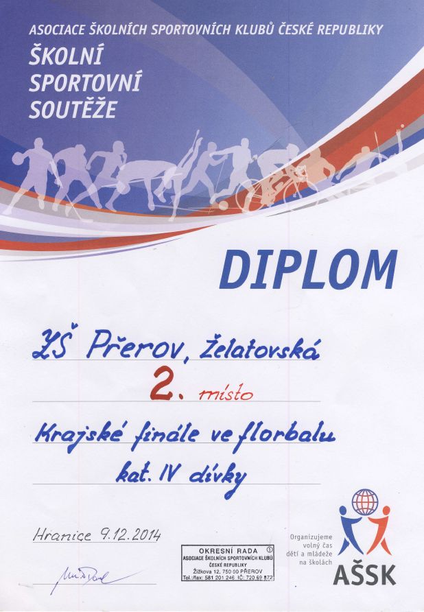V úterý 9. 12. 2014 se starší žákyně znovu mohly radovat. Po vítězství v okresním kole florbalu si po těžkých zápasech vybojovala 2. místo v krajském kole, které se (po týdenním odkladu kvůli ledovce) opět konalo v Hranicích. Náš tým ve složení Jana Chmelíková, Barbora Vaníčková, Petra Mužíková, Nikola Jančová, Andrea Plhalová, Veronika Polívková, Eliška Frantová, Eva Boháčová, Klára Nováková, Tereza Vlková a Dominika Marková dělil od postupu na mistrovství republiky ČR jen malý krůček. Děvčata neutržila ani jednu porážku. Dobře skórovala nejdříve s Olomoucí 2: 1, pak s Němčicemi na Hané 6:0, dále remízovala s Žulovou 2:2 a v závěru porazila i tým Šumperka 2 : 1.