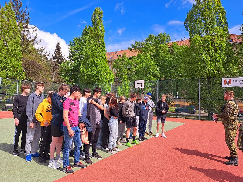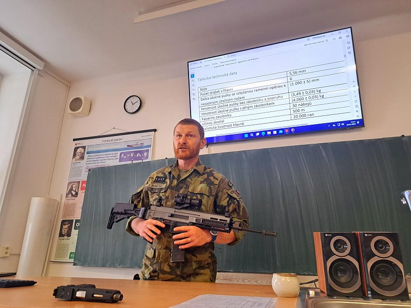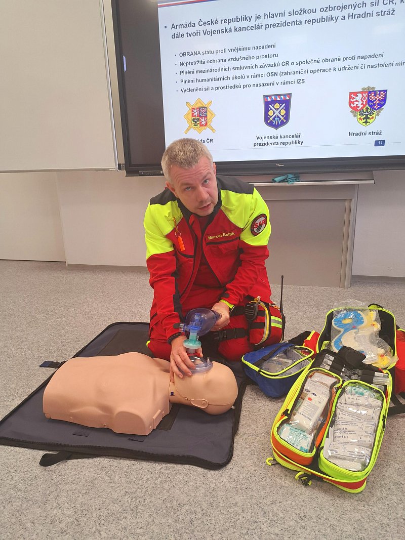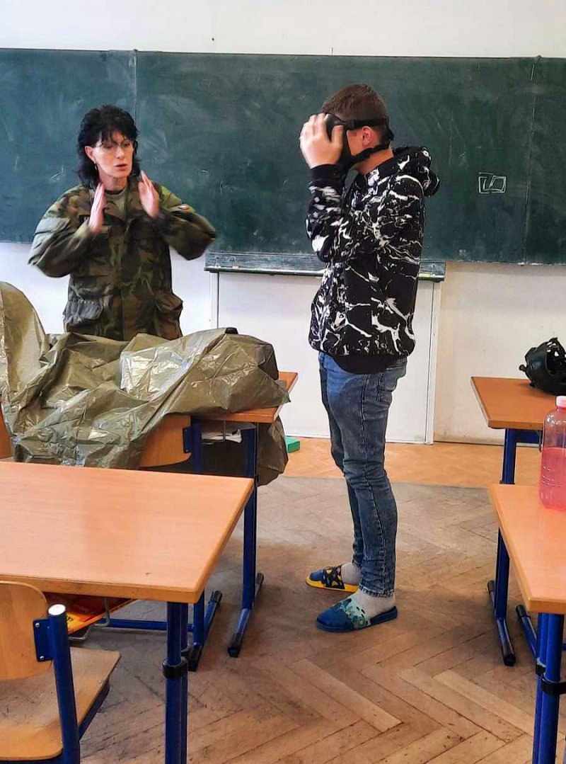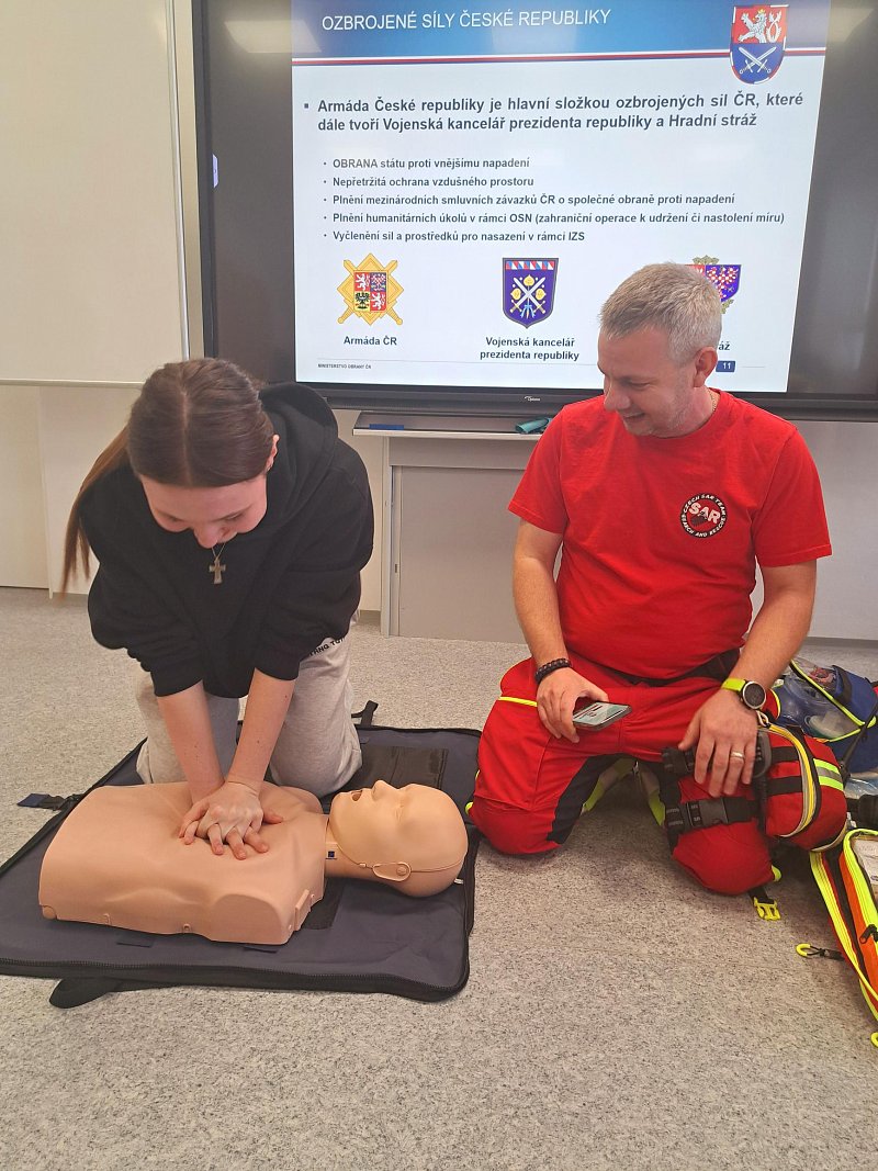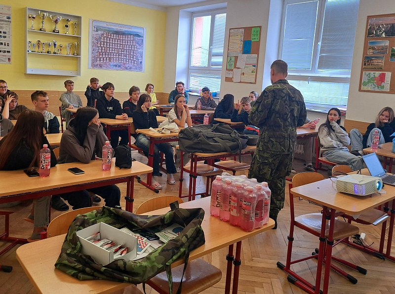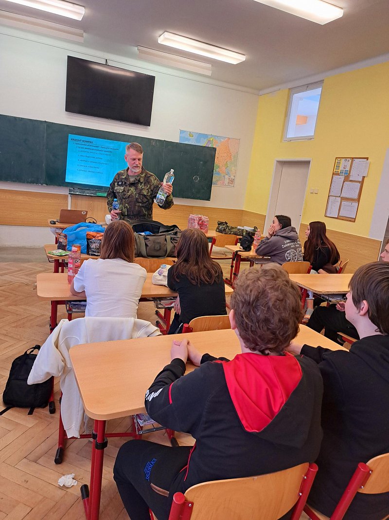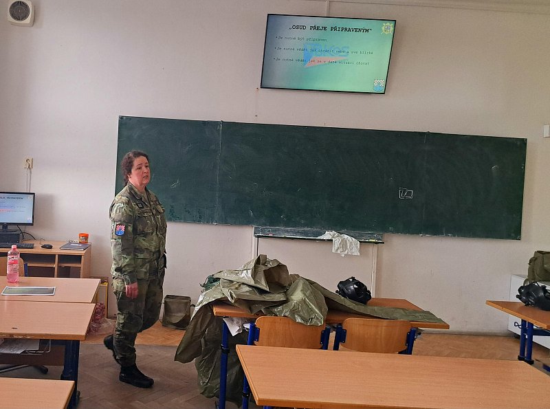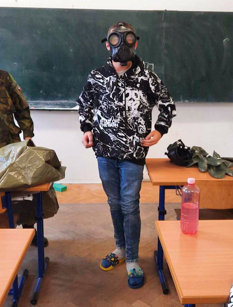 Žáci se aktivně zapojili do přednášky o tom, jak zvládat nečekané krizové situace, měli možnost si nacvičit masáž srdce, vyzkoušet masku M-10M nebo protichemický oblek a seznámit se s nejčastějšími ručními zbraněmi AČR a jejich manipulací.