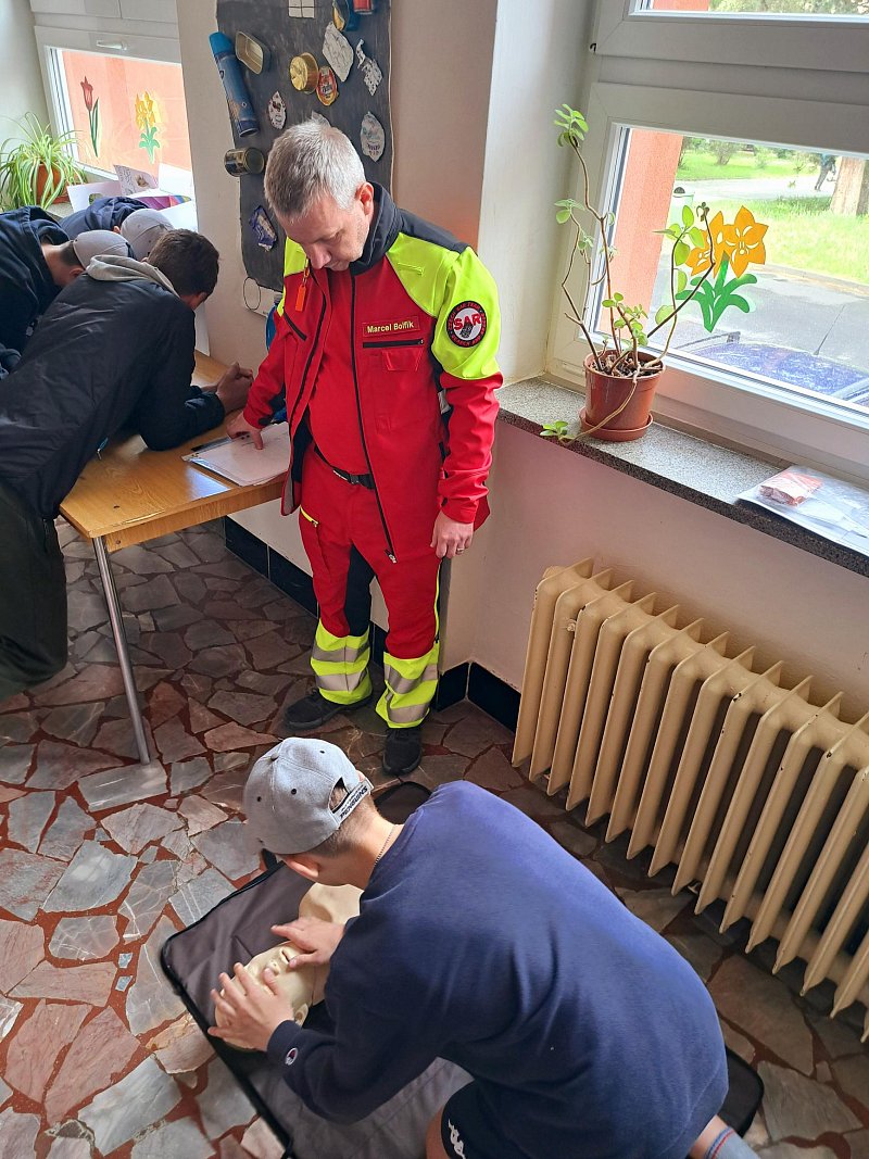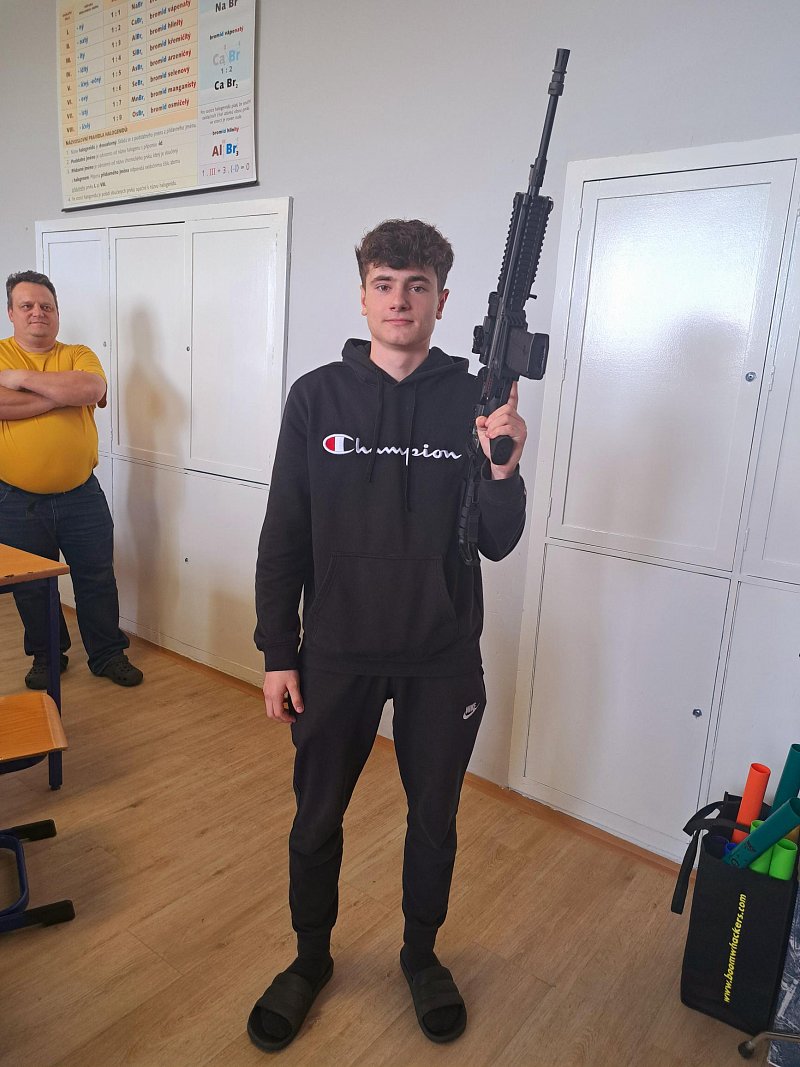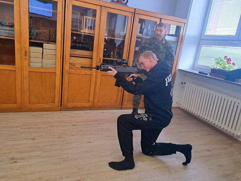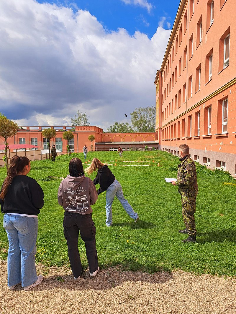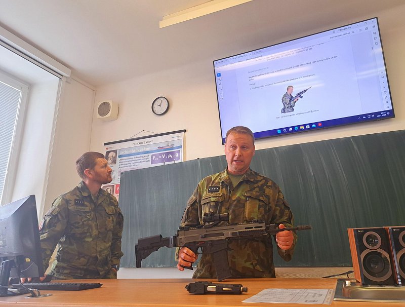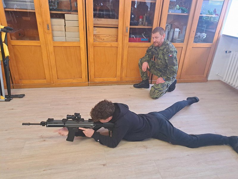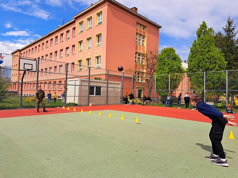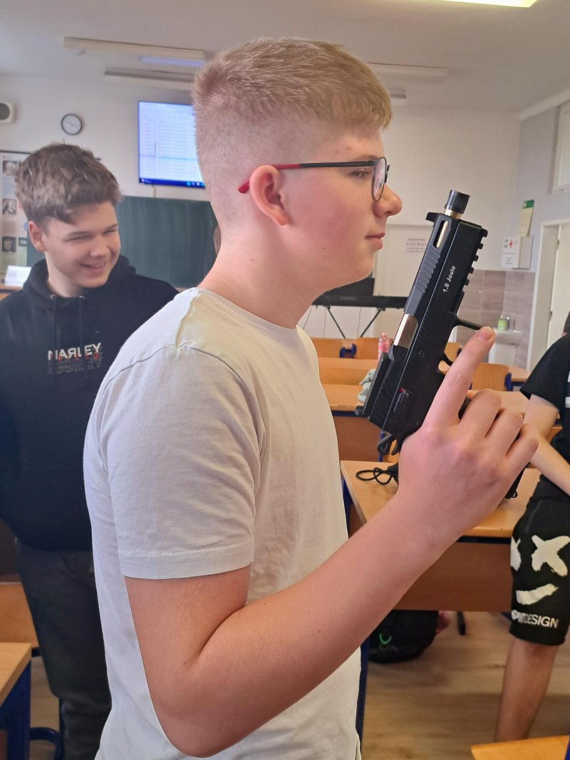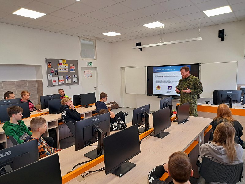 Žáci se aktivně zapojili do přednášky o tom, jak zvládat nečekané krizové situace, měli možnost si nacvičit masáž srdce, vyzkoušet masku M-10M nebo protichemický oblek a seznámit se s nejčastějšími ručními zbraněmi AČR a jejich manipulací.
