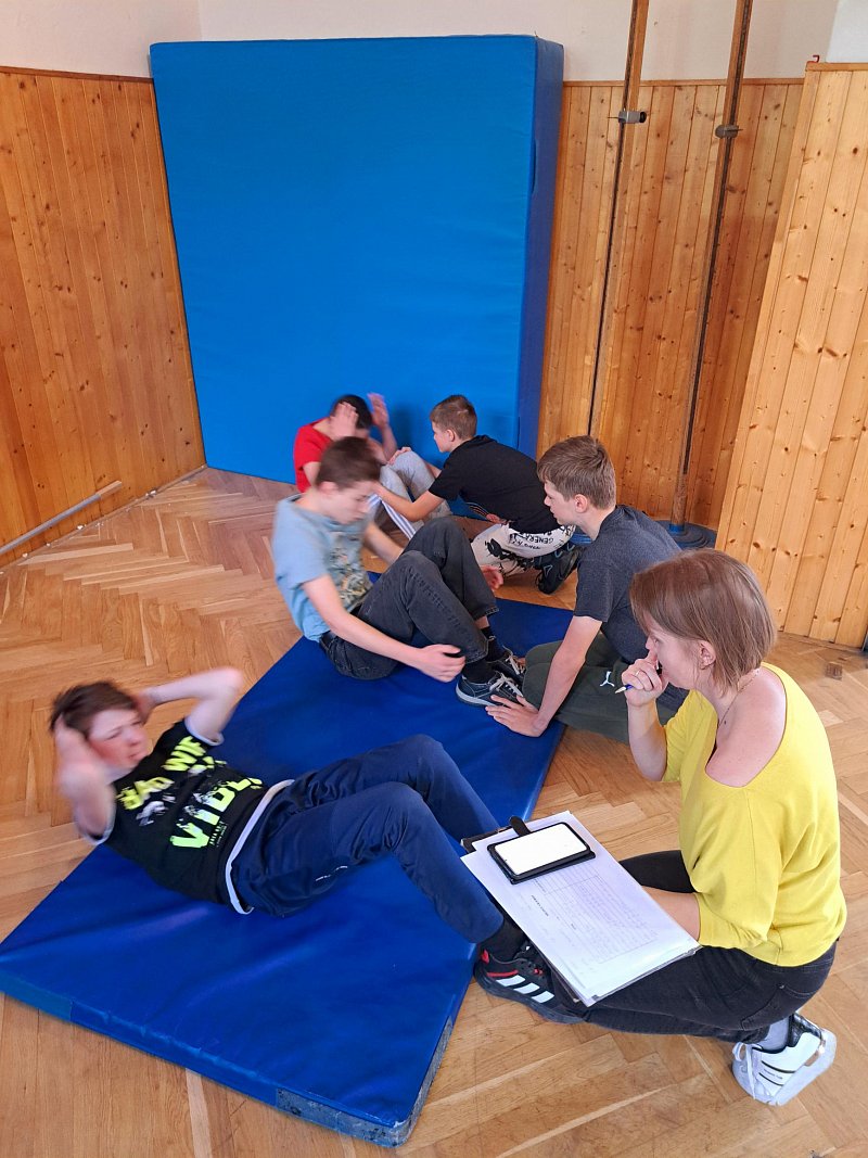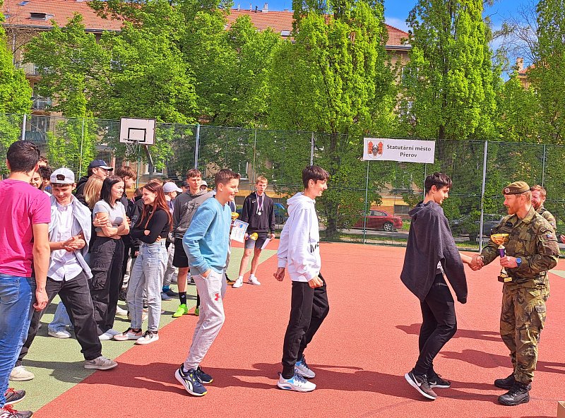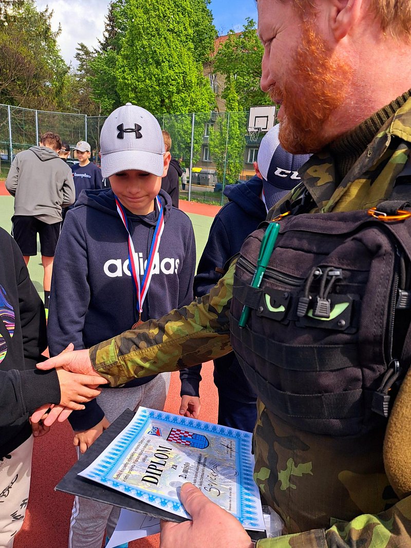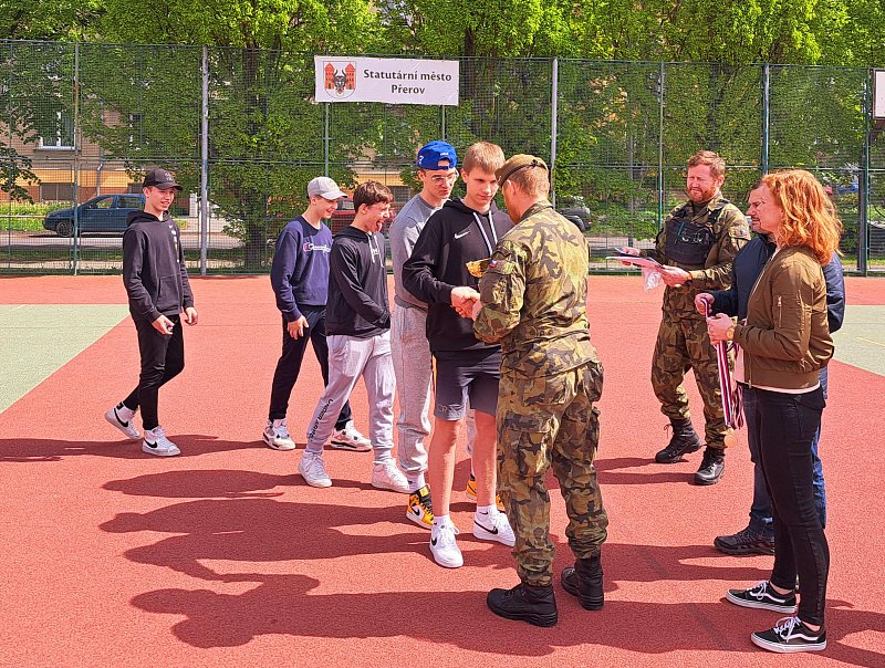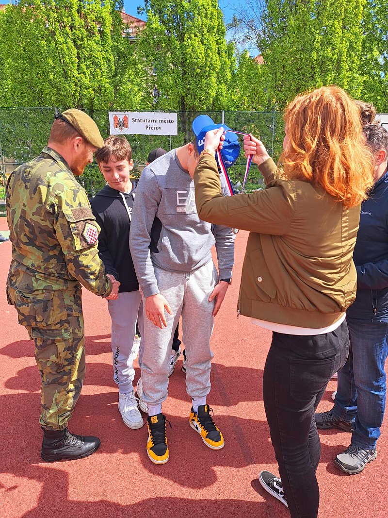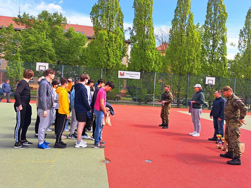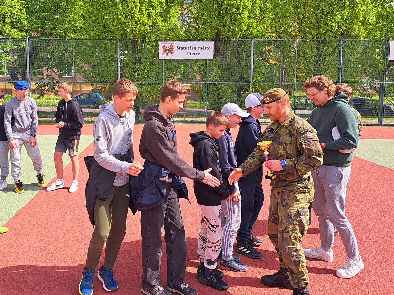 Odpolední část programu obsahovala sportovně-vědomostní soutěž, jíž se zúčastnilo 6 pětičlenných družstev (jedno čistě dívčí). Kromě překážkové dráhy v tělocvičně si žáci vyzkoušeli i hod granátem, silové testy AČR a prokázali teoretické znalosti, které získali v dopoledních přednáškách. Vítězné družstvo se v červnu zúčastní krajského kola, které pořádá Krajské vojenské velitelství Olomouc.