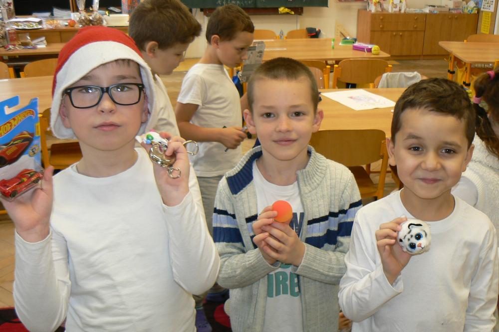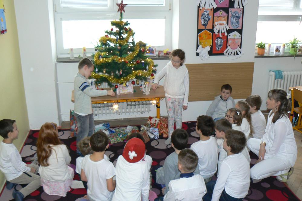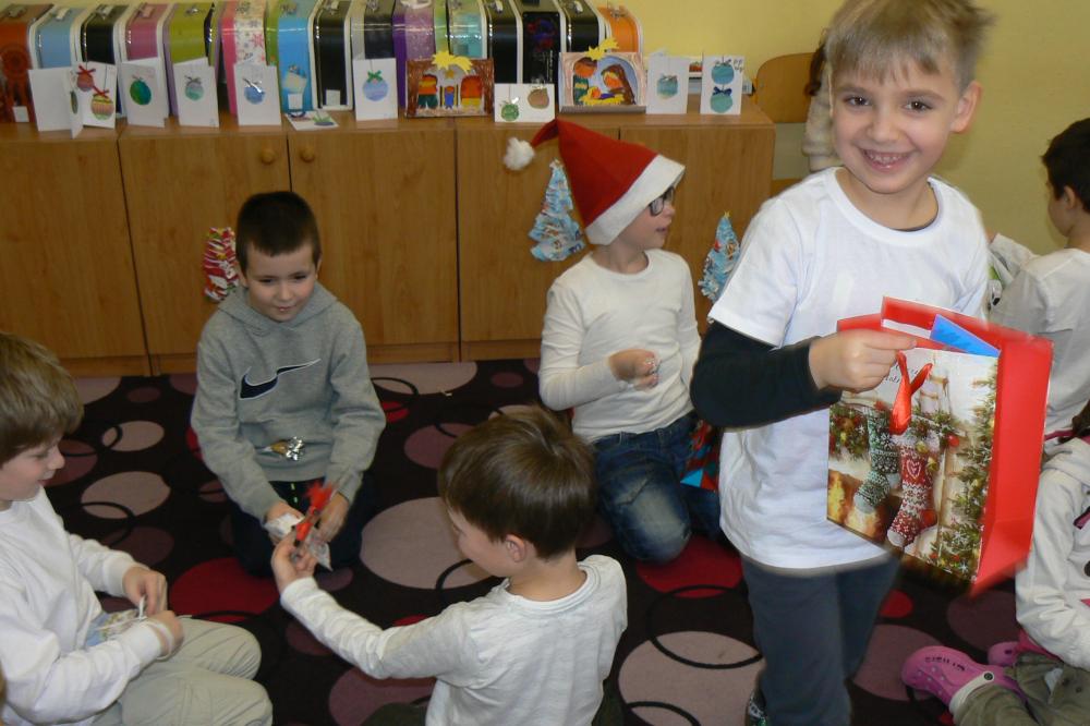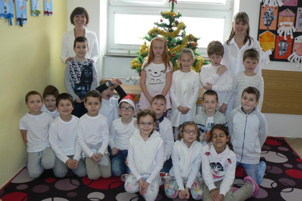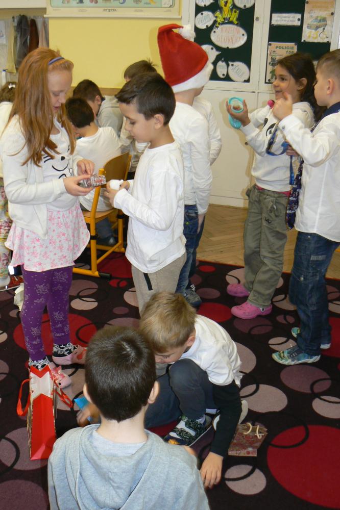 Dnes aktovky zůstaly doma a my přišli do školy v bílém. Přinesli jsme si cukroví a hry. Pracovali jsme ve skupinách, ve kterých jsme tvořili obrázky vztahující se k Vánocům. Čekala nás ochutnávka cukroví, děvčata házela papučí, rozkrojili jsme jablíčko, pouštěli jsme lodičky. Nejkrásnější bylo zpívání koled u stromečku a nadělování dárků. Na závěr jsme si popřáli krásné Vánoce, hodně zdraví a štěstí v novém roce. Třídu jsme pěkně uklidili a spokojeni jsme odcházeli domů.
