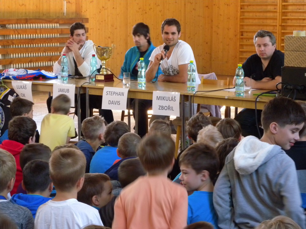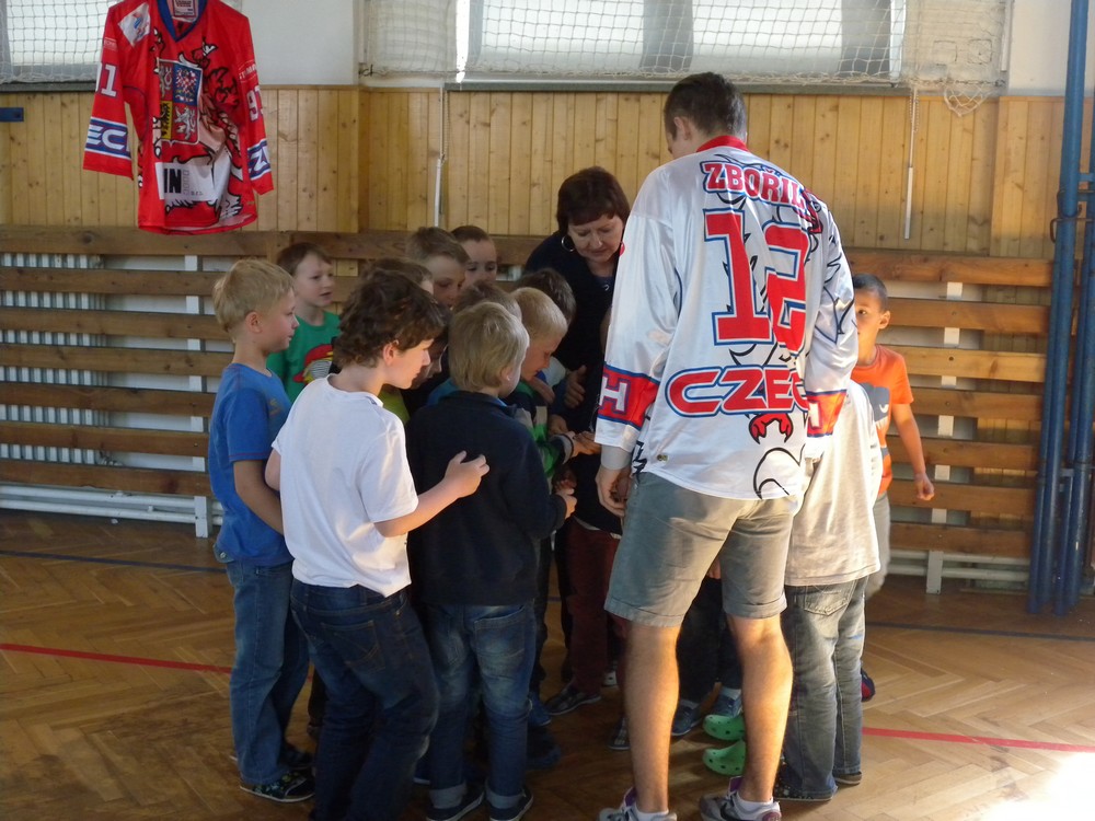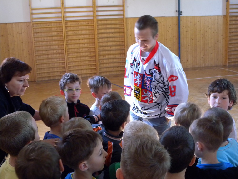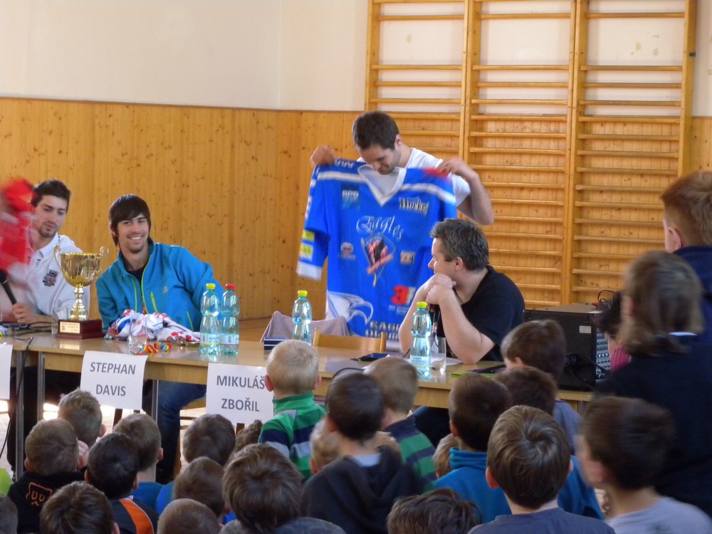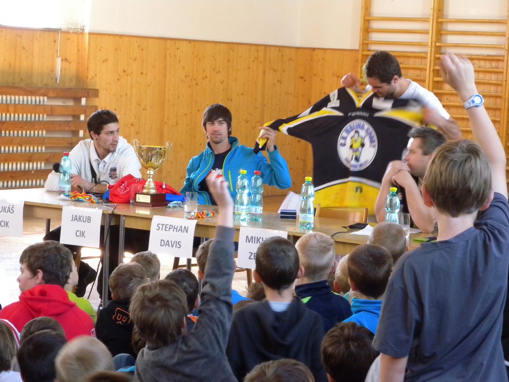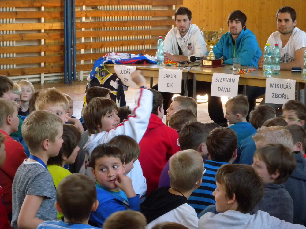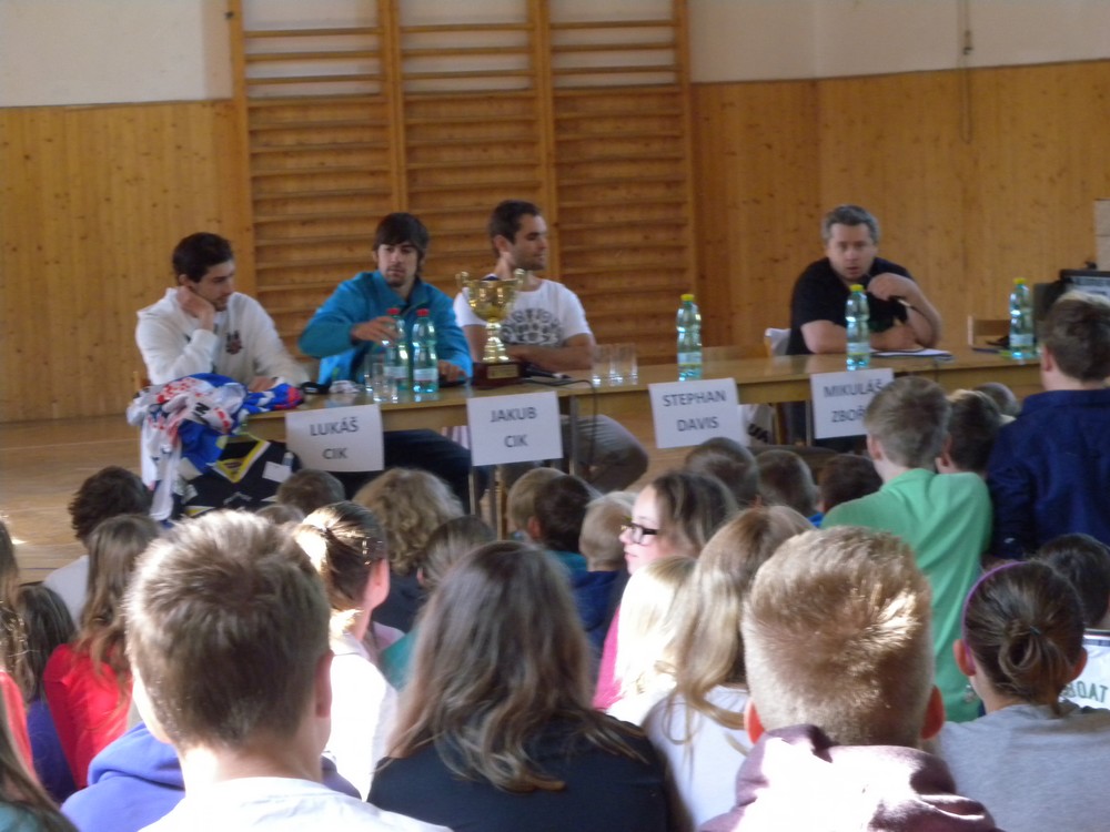 V úterý 6. května se mohli žáci hokejových tříd ZŠ Želatovská seznámit se zákulisím sportu, který získává v posledních letech na popularitě. Je velmi podobný hokeji, kterému se kluci věnují, jen je potřeba vyměnit ostré nože za kolečka. O svých zkušenostech s hraním in line hokeje v lize i v reprezentaci se přišli s žáky podělit držitelé mnoha madailí z mistrovství světa i ze světových her Lukáš Cik, Jakub Cik, Stephan Davis a Mikuláš Zbořil. Otázka stíhala otázku a čas určený na besedu rychle uběhl. Na závěr došlo i na společné focení a žáci si mohli zblízka prohlédnout jak medaile, tak i reprezentační dresy.