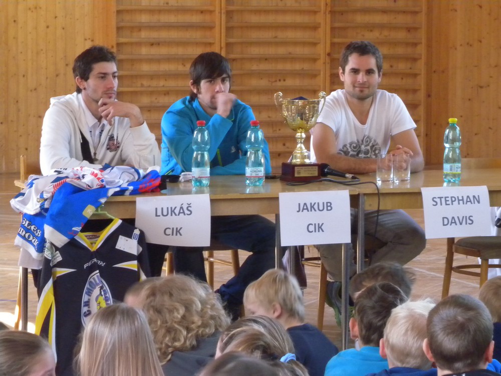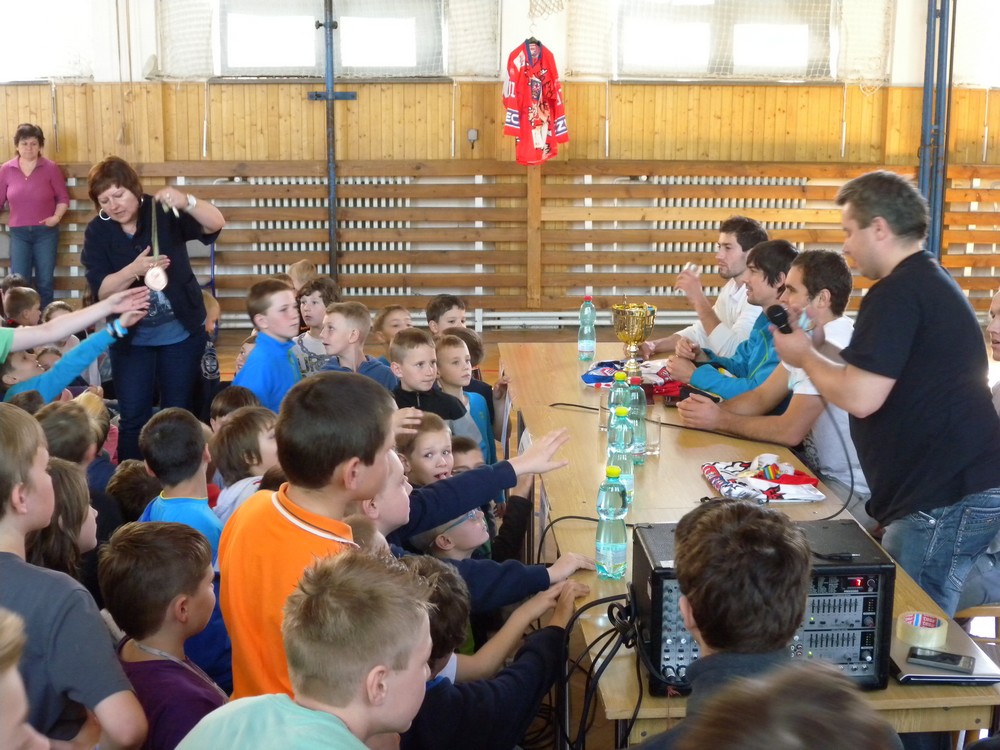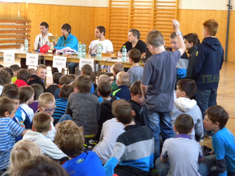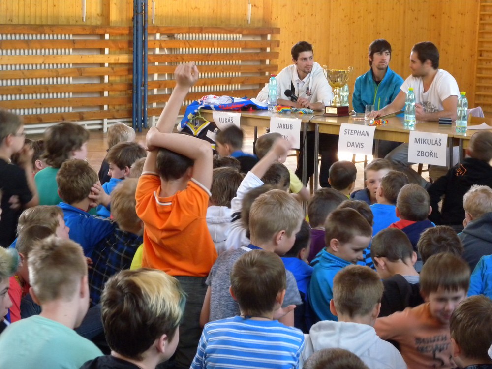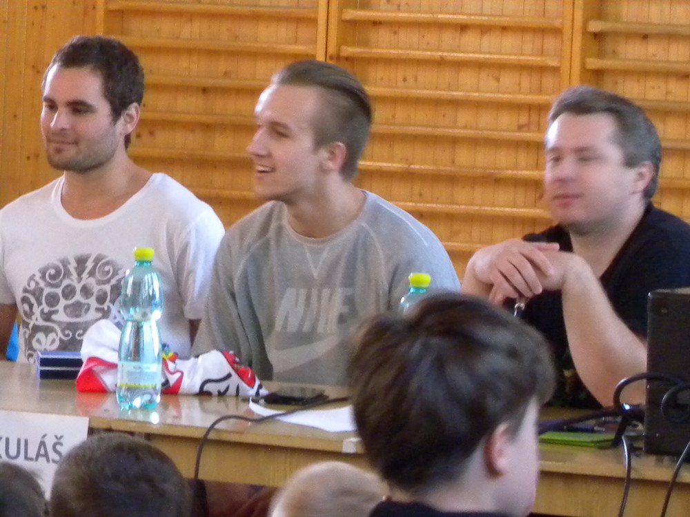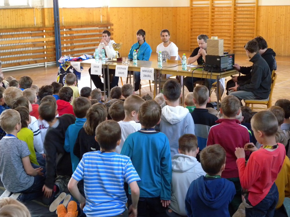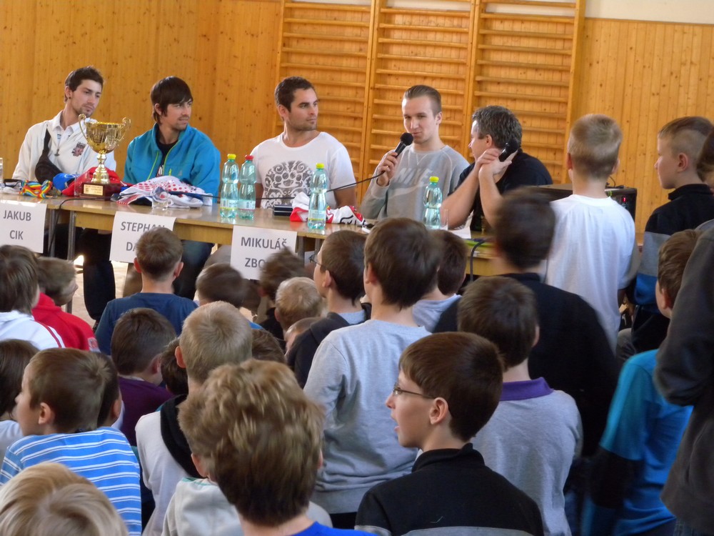 V úterý 6. května se mohli žáci hokejových tříd ZŠ Želatovská seznámit se zákulisím sportu, který získává v posledních letech na popularitě. Je velmi podobný hokeji, kterému se kluci věnují, jen je potřeba vyměnit ostré nože za kolečka. O svých zkušenostech s hraním in line hokeje v lize i v reprezentaci se přišli s žáky podělit držitelé mnoha madailí z mistrovství světa i ze světových her Lukáš Cik, Jakub Cik, Stephan Davis a Mikuláš Zbořil. Otázka stíhala otázku a čas určený na besedu rychle uběhl. Na závěr došlo i na společné focení a žáci si mohli zblízka prohlédnout jak medaile, tak i reprezentační dresy.